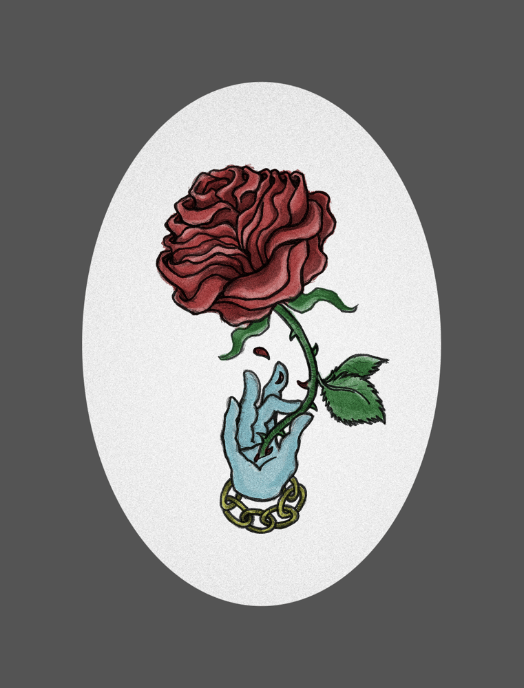 A rose presented from the palm of a hand.